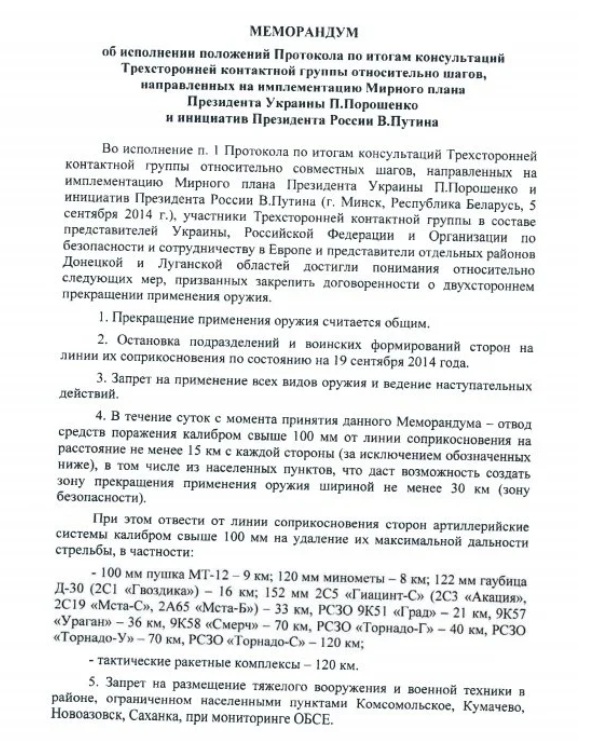 Нижче документ, який було підписано 19 вересня 2014 року у Мінську та опубліковано ОБСЄ.